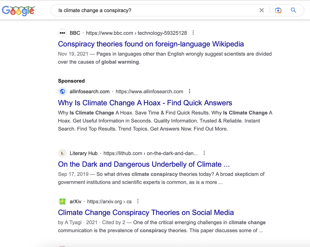 While the outcomes given by Google are dually blended and do incorporate news features that unload the issues related to the spread of connivance mentalities, the main page of connections Google gives unquestionably doesn't underscore obviously sufficient that environmental change is as a matter of fact a genuine and dire issue for the sum of humankind.